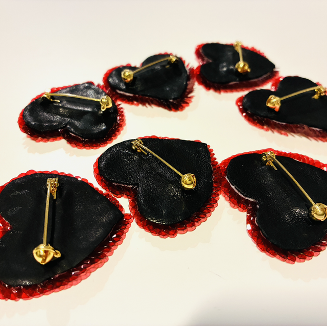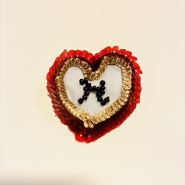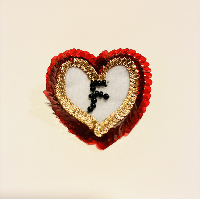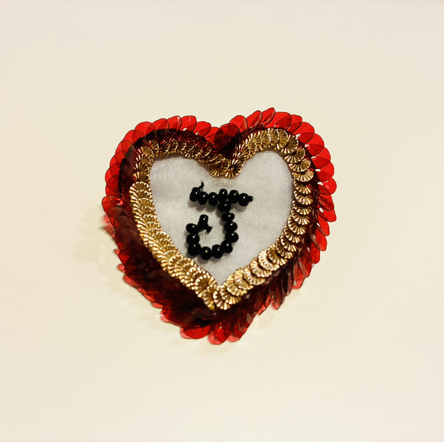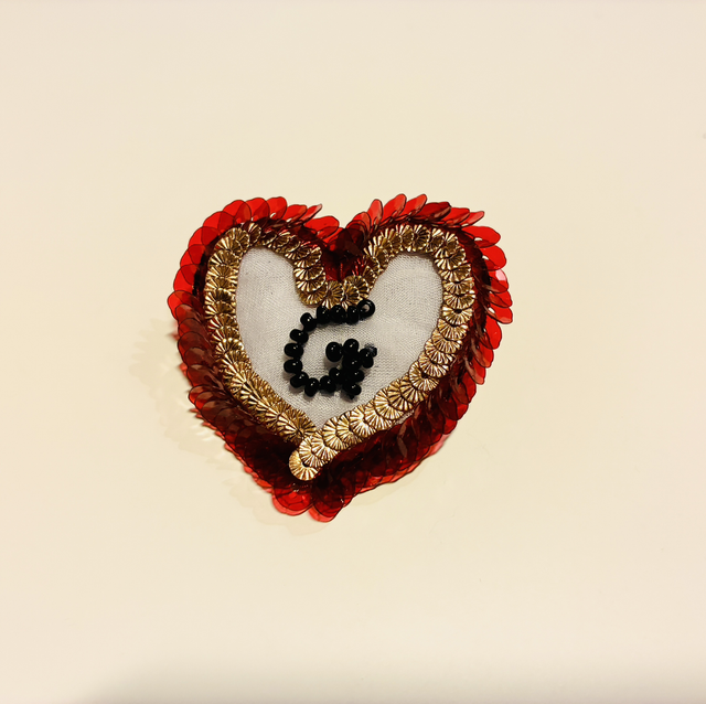 Matériaux utilisés : Cuvettes à broder, paillettes à broder, fil à broder métallique, organza de soie, cuir (dos)